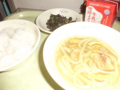 カレーうどんは,大人気の献立で食べる前から楽しみにしている児童がたくさんいました。低学年の児童にも食べやすい大きさに具材が切られていて,おかわりをする児童がたくさんいました。児童からは「だしの味がしておいしかった」「少しピリッとしていておいしかった」などの声を聞かせてくれました。