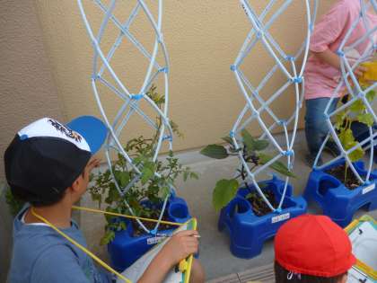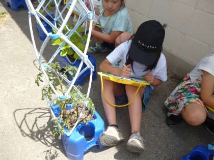 鳴門金時だけでなく,自分の鉢で育てている野菜も順調に育っています。今日はどれぐらい育ってきたか,観察をしました。花が咲いているもの,小さな実が付いているもの,1か月でずいぶん背丈も伸びています。「花から実ができるとは知らなかった」と,大発見をしている子もいました。