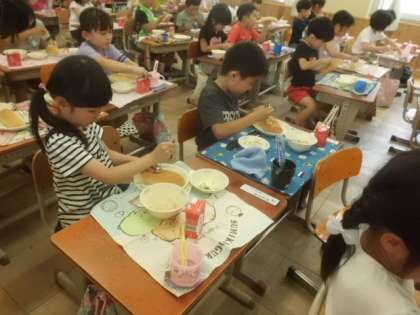 ツナサンドは,自分でツナサンドの具とマヨネーズをパンに挟んで食べる献立でした。写真は一年生で,楽しそうに自分のツナサンドを作って食べていました。児童からは「あっさりとしておいしかった」「キャベツが甘くておいしかった」などの声を聞かせてくれました。