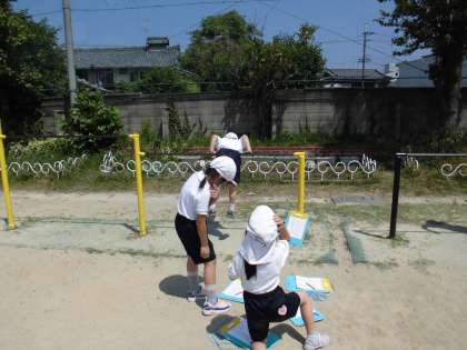 体育科では「てつぼうあそび」をしています。いろいろな技にグループで教え合いながら挑戦しています。