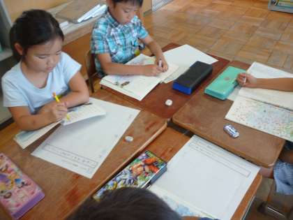 国語では「スイミー」のお話を学習しています。先日はお話の「はじめ・中・おわり」を見つけるために,グループで話し合いました。「スイミーの紹介があるから,ここがはじめかな。」「中はどこまでやろ。」と悩みながら,お互いの意見を聞き合い,みんなで考えていました。