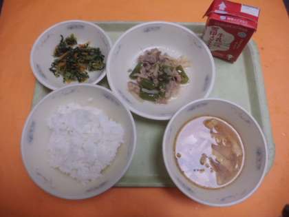 豚肉と万願寺とうがらしのいためものは,生姜を入れていたので豚肉の臭みもなく,あっさりとした味で食べやすかったです。児童からは「万願寺とうがらしの色がきれい」「あっさりとしていて美味しかった」などの声を聞かせてくれました。