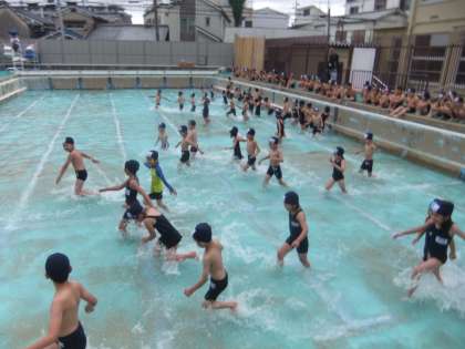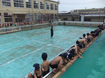体育で,1年生で初めての水遊びをしました。大きなプールやシャワーにみんな大喜び。話をよく聞いて,あんぜんに水遊びができるよう話した後,水慣れやバディ確認をしました。静かに入水ができて,ばっちりの1年生でした。