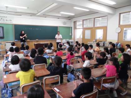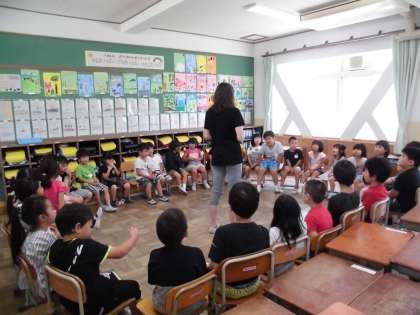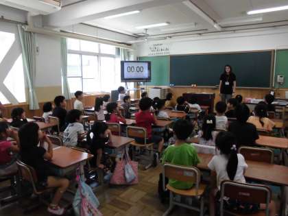 ALTのモンタナ先生と一緒に英語の学習をしました。初めての英語の学習に大はしゃぎの子どもたち。数字について,楽しく学ぶことができました。