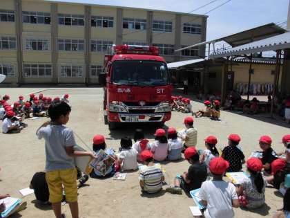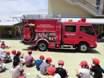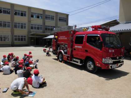 6月26日(水)に避難訓練を行いました。その後,訓練に来ていた消防車を写生する子どもたち。よく見て描き進めていきました。