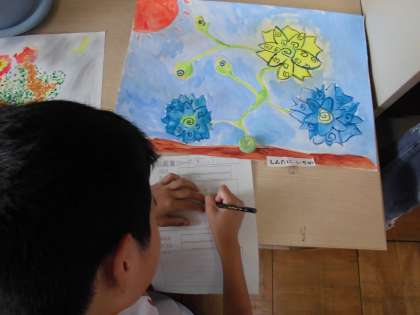 形や色,道具の使い方などに注目して,友だちの絵を鑑賞しました。良いところや工夫されているところを見つけようと,一つ一つの作品をじっくり観る姿が素敵でした。