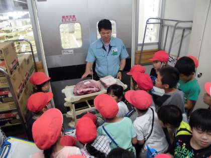 社会科の「商店のはたらき」の学習で,スーパーマーケットがどのような工夫をしているのかを見学に行きました。普段は見られない,お店の裏側も見せていただき,食品を保存する冷蔵庫や冷凍庫があることや,お店で売られる前の大きな肉の塊も見せていただきました。