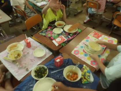 ポークビーンズは,大豆をじっくりと茹でて作りました。豆が柔らかく,具材にも味が染みていて美味しかったです。児童からは「パンと一緒に食べると美味しかった」「豆が柔らかくて美味しかった」などの声を聞かせてくれました。