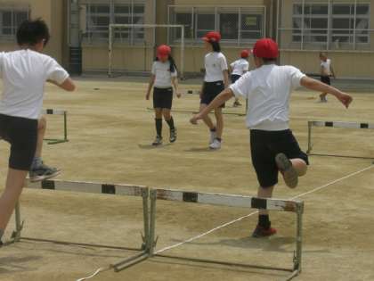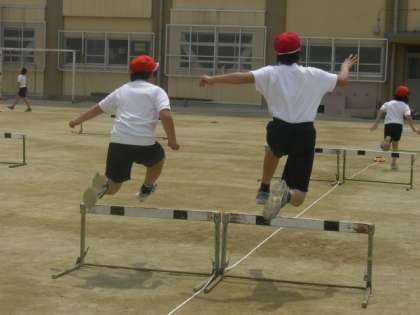 5年生は,障害物走ではなくハードル走をします。ハードルのとび方やハードルの小幅あわせの練習をしました。