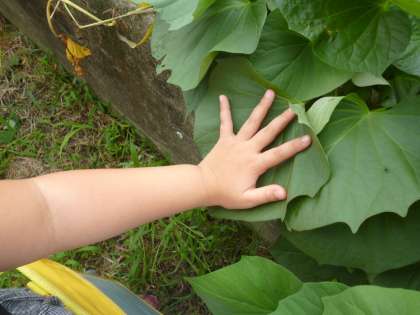 2学期が始まり,鳴門金時がどんな様子になっているか,ワクワクしながら観察に行きました。夏休みの間,鳴門金時はすごい勢いで生長し,葉っぱのジャングルのようになっています!この下にお芋ができてきているのかな・・・。手よりも大きい葉っぱに,子どもたちもびっくりしていました。