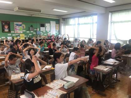 ALTの先生に夏休みの出来事を聞いてみると「東京から静岡まで歩いた。」とのことで,子供たちもびっくり。