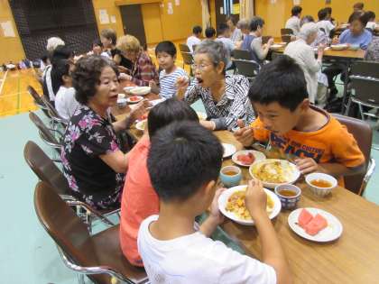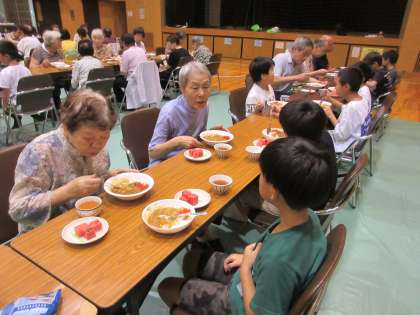 美味しそうに食べる子どもたちの傍らで,やさしく微笑むお年寄りの姿が印象的でした。