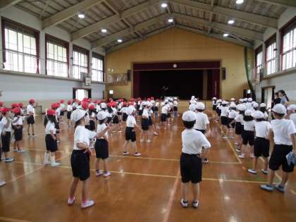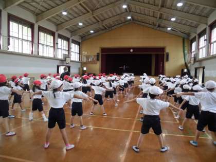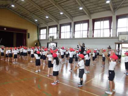 運動会の団体競技の前にする準備運動ダンス。バシッとそろってきましたよ。