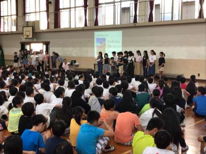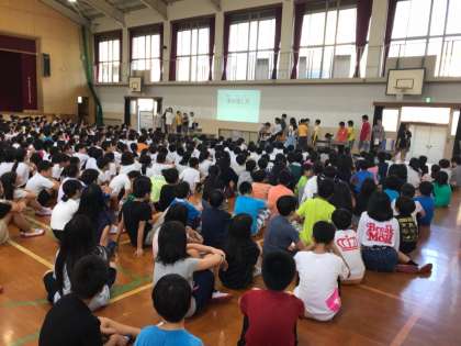 9日(月)の朝会で緑化委員会と図書委員会の発表を聞きました。