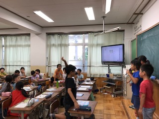 What do you like?の学習で,ステレオゲームを行いました。各班の人が同時に言うI like ○○.の重なりをよく聞いて○○を当てるゲームです。食べ物や果物,色など,様々な重なりをよく聞いて答えていました。