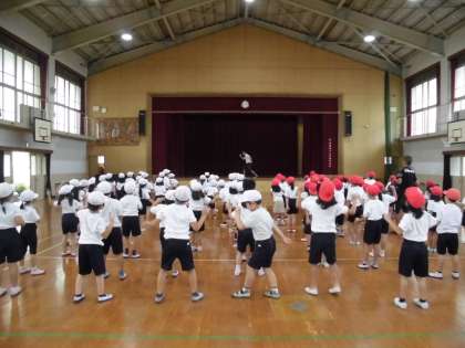 運動会の団体競技の前にする準備運動ダンス。今日は初めて音楽に合わせて踊りました。はじめは少し速いテンポに戸惑っていた子どもたちも次第に慣れ,最後にはお手本がなくてもきちんと踊れました!