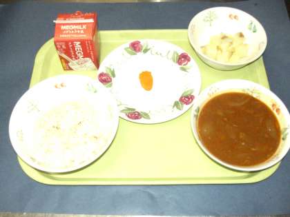 「ハッシュドビーフ」の「ハッシュ」というのは、材料を「細かく切る」という意味があります。給食では手作りのブラウンルーとトマトを使って、細かく切った牛肉や野菜をじっくり煮込みました。