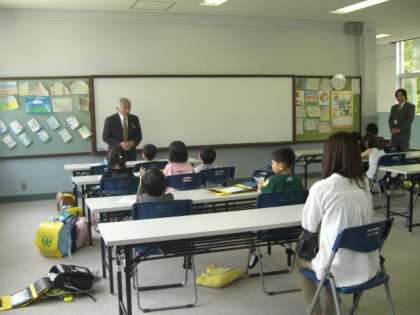 開講式には,保護者の方にも出席していただき,いっしょにお話を聞いていただきました。運営委員長のお話のあと,学校長の話,アドバイザーの紹介がありました。1年生はいっしょうけんめいにお話を聞き,教室での約束をいっしょに確かめていました。