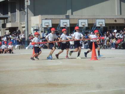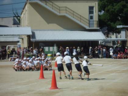運動会で,3年生は団体競技で台風の目を行いました。各組4,5人で,協力して右回り,左回りを行いました。どちらの組も力いっぱい走り切りました。