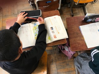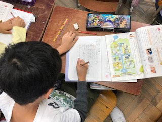 国語科の学習で,これまでに習った漢字で教科書の挿絵にあった文章を書く学習に取り組みました。町の様子をしょうかいするために,理科で習った東西南北も活用して,市場のにぎわう様子や,建物の紹介を文章にまとめていました。