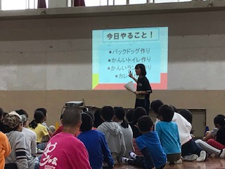 塔南高校生からぼうさいキャンプの意義についてお話がありました。内容もわかりやすく大人顔負けのプレゼンで小学生の子どもたちは聞き入っていました。