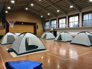 夜は体育館にテントを立てて寝袋で寝ます。