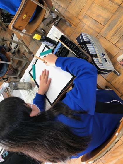 書写の授業で「あこがれ」という文字を書きました。穂先の動きや,筆の流れに気を付けて書きましたが,ひらがな4文字を書くのは難しく,なかなかバランスがとりにくいようでした。