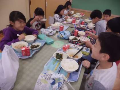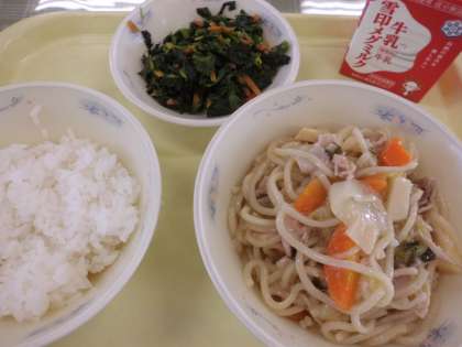 五目あんかけラーメンは,豚肉や人参・白菜など具沢山のあんかけラーメンでした。たくさんの具材が入っていて,彩りがきれいでした。児童からは「たけのこが苦手だったけど食べれた」「いろんな野菜が入っていておいしかった」などの声を聞かせてくれました。