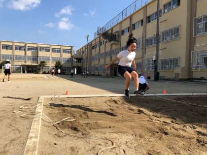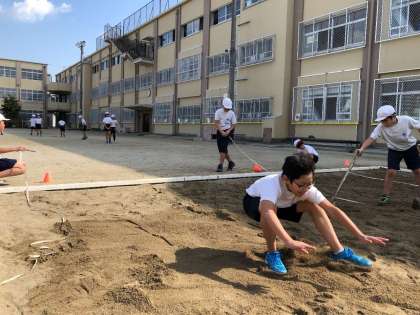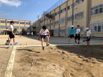 安全に気をつけて声をかけあったり,記録が伸びるように踏み切りや着地を意識したりしながら活動を進めています。