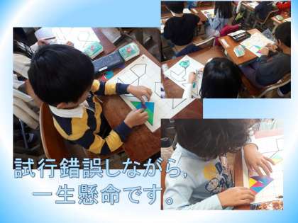 色板を動かして平行移動させたり,ひっくり返して対称移動させたり。まずは自分で考えます。集中して一生懸命に試行錯誤して考えています。その間,出来上がった子どものプリントに○つけをしたり,悩んでいる子どもに励ましの声かけをしたりして,教室中を動きまわり,先生も一生懸命です。
