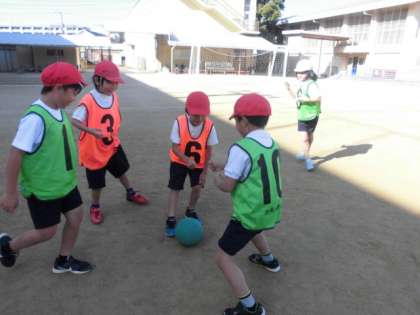 体育の勉強で「パスゲーム」をしました。友達と仲良く,楽しくゲームをするために,自分たちでルールを考えて取り組んでいます。パスを上手に回すことができています!