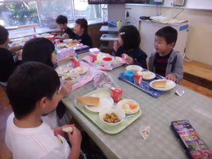 ランチルームで給食を食べました。普段とは違う場所で給食を食べることで子どもたちはいつも以上に班の友達と交流しながら給食を食べていました。また食べ終わった後は,給食を食べた感想を書きました。