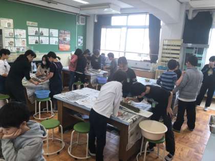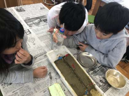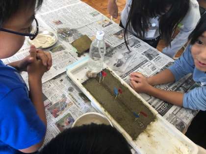 実際に水を流し,砂の削れ具合や旗が立っているかに注目します。実験結果から,真ん中の流れが一番早いことが分かりました。また,水が流れることで旗が倒れ,人工の川幅が広がっていることが分かりました。