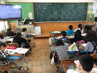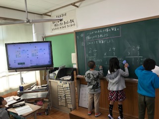 算数科の学習で,「1けたをかけるかけ算の筆算」に取り組んでいます。この日は,十の位にくり上がる筆算の計算の仕方を考えました。くり上がりをどのように表すのが良いのか,みんなで話し合って確認した後,練習問題を通して,内容を定着させていきました。