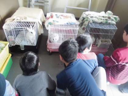 他学年の学習のため,ゲストとして来校した「ウサギ」さんを見て,