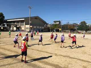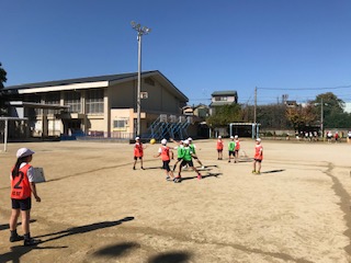 体育科の「エンドボール」の学習が進んでいます。「ボールをもらう時には,相手の守備をよけて,素早く動いてもらいやすいようにする。」「声を掛け合って,味方にボールを出す場所を教える。」「ボールを投げる時には,相手の守備が来る前にすばやくパスやシュートをする。」など,それぞれのチームで作戦を考え,シュートにつなげる場面が増えてきました。