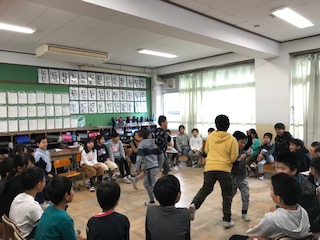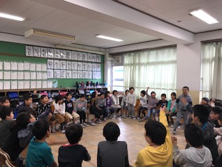みんな遊びで,なんでもバスケットを行いました。「好きなフルーツが○○な人」「○色が好きな人」「好きな季節が○○な人」など,定番のものから,好きなマンガ,キャラクター,習い事等,友だちの新しい一面を知るきっかけとなり,盛り上がりました。