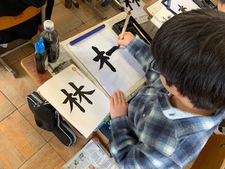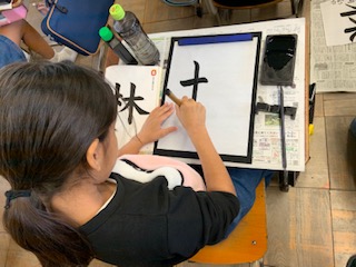毛筆の学習で「林」という字に取り組みました。「へん」と「つくり」の幅や点画の形に気を付けて書きました。一画一画お手本を確認しながら,丁寧に,姿勢よく書くことができました。