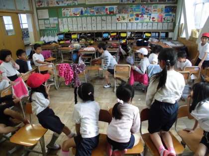 今回のみんな遊びは「いすとりゲーム」音楽に合わせて踊りながら歩く子どもたち。座れても座れなくてもわいわい楽しむ姿が見られました。