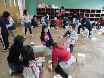 図画工作科「いろいろな はこから」では,箱を並べたり積んだりして,いろいろなものを作っていきました。子どもたちの自由な発想が楽しかったです。
