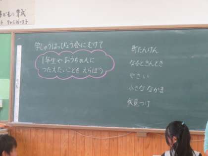 一年生に学習してきたことを伝えるために,まずは何について発表したいのかを考えました。また,どんな形で発表をするのかアイデアを出し合いました。今,準備をすすめています。