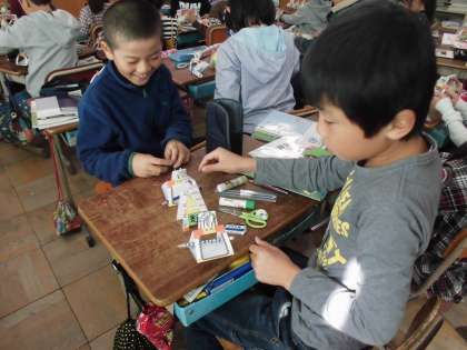 算数科で「重さ」の学習に入りました。最初に文房具を手に持って重さを比べましたが,分かりにくいということで,てんびんを紙で作って比べました。「消しゴムと鉛筆とどちらの方が重いかな。」「僕の消しゴムと友達の消しゴムとどちらの方が重いかな」など,右と左のお皿にいろいろと文房具を乗せて比べました。