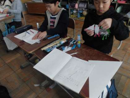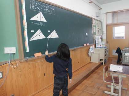 算数科「三角形と四角形」の学習で,三角形を二つに切ると,どんな形になるのか考えました。三角形と四角形ができたり,三角形が2つになったりするところから,決まりを見つけていました。