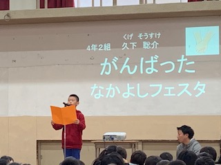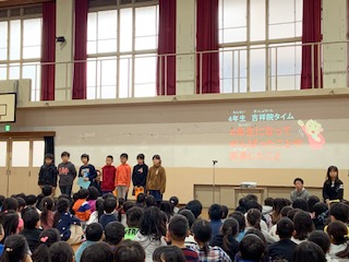 今回は4年生の吉祥院タイムでした。「4年生になって頑張ったことや成長したこと」について,代表の6人が発表しました。学習発表会で学んだことを活かして,相手にわかりやすく伝わるように発表することができました。