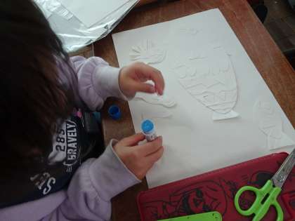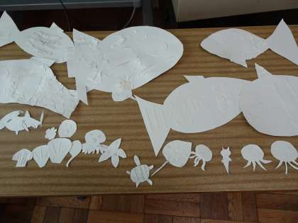 図画工作科の授業で紙版画に挑戦しています。テーマは「海の生き物」です。想像を膨らませながら楽しんで活動しています。実際に刷るのが楽しみですね。