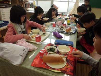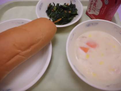 コーンのクリームシチューは,給食室でルウから作りました。児童からは,「コーンが甘くておいしかった」「パンとの相性が良かった」などの声を聞かせてくれました。