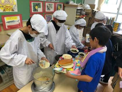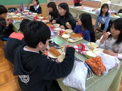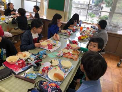 ランチルームで学習をした後は,教室ではなくランチルームで給食を食べます。普段は給食当番が配ってくれますが,ランチルームでは自分達で給食を取りに行きます。みんなで美味しくいただくことができました。