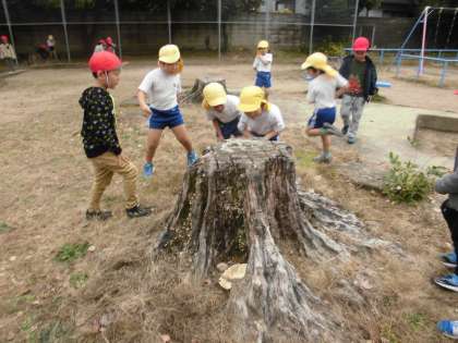 政所公園で秋探しをしていると,近くの吉祥院こども園より園児たちがやってきました。どんな秋を見つけたかを教えたり,一緒に落ち葉のシャワーをして楽しんだりする姿が見られました。