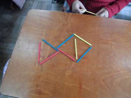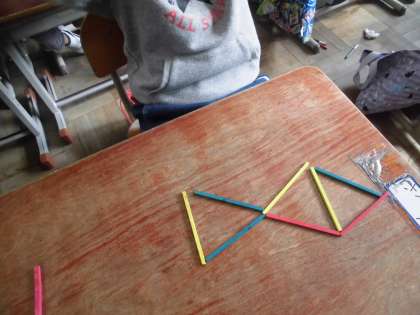 算数科「かたちづくり」では,棒を使っていろいろなかたちを変える学習をしました。同じところに目をつけて,違う部分を動かしていくという考え方ができるようになりました。