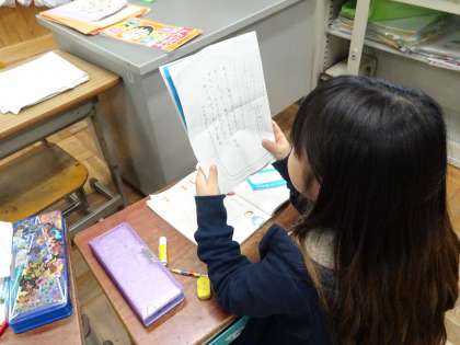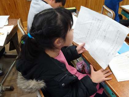 国語科「あったらいいなこんなもの」であったらいいなと思う道具を考えて発表します。発表会に向けて練習をしている場面です。聞いている人に分かりやすく伝えられるように頑張っています。